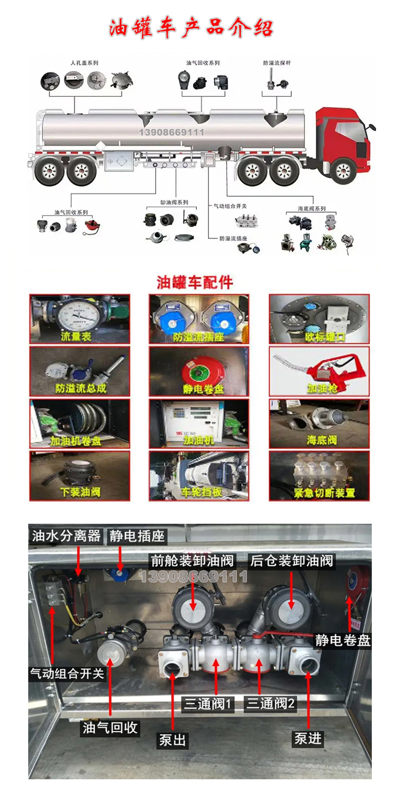 油罐車/加油車/運油車主要用于石油化工部門各種輕質燃油、重油、食用油等的運輸,具有吸油,泵油,多種油分裝,分放等功能.可獨立分倉,可分裝不同的油品、化工品、食品.設計上可實現(xiàn)泵進、泵出過表,泵進、泵出不過表,自流過表、不過表等功能.
