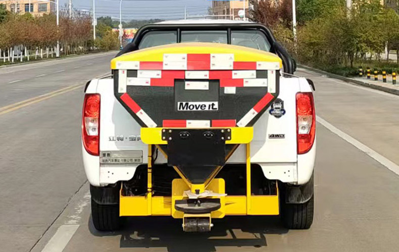 該車(chē)裝有前安裝架,裝備撒布機(jī),選裝推雪鏟和除雪滾刷.