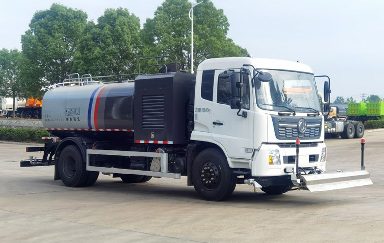 ★清洗車專用部分由上取力器、傳動軸、高壓水泵、罐體(位于車輛前部,與吸污罐體是分離式)、自動卷盤、高壓水管、多路換向閥、卷盤操作閥組成。高壓水泵壓力:16-19Mpa 、流量:8m3/h 、水管長度:60/100m。常配10個噴頭。清洗路面加裝前噴水架,噴水架清洗寬度2.5m-3.5m,噴水架可升降、伸縮、左右平移,可實現多重水流強化清洗,適用于清洗城市道路、廣場。