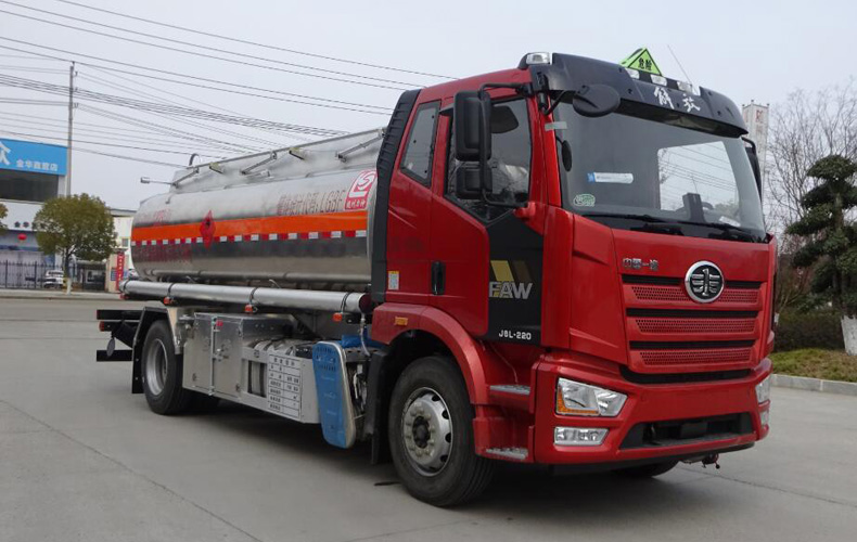 罐體總容量:13.9立方米,罐體有效容積:13.2立方米,危險貨物運輸車輛的類型:FL型車輛,介質zui大密度830千克/立方米;罐體尺寸(長×長軸×短軸)(mm)為:5700×2100×1500;僅采用4700(mm)軸距;選裝罐體兩側管廂樣式及出口箱樣式;側、后防護裝置材料材質:Q235B,側、后防護均用螺栓連接,后部防護裝置斷面尺寸(寬×高)80×150(mm),后部防護離地高度:490mm;安裝具有衛(wèi)星定位功能的行駛記錄儀,僅采用子午線輪胎,前輪裝配盤式制動器,排氣消聲器及排氣管前置;安裝限速裝置,限速79km/h;安裝EBS,型號:EBS3,生產(chǎn)廠家:威伯科汽車控制系統(tǒng)(中國)有限公司;僅適用發(fā)動機對應油耗值(L/100km)為:CA4DK1-22E61(22.0),CA4DK1-18E61(22.0),CA4DK1A18E61(22.0), CA6DH1-24E61(23.9).該車后軸采用空氣懸架;轉向輪安裝爆胎應急防護裝置;選裝直接供電式ETC車載裝置;