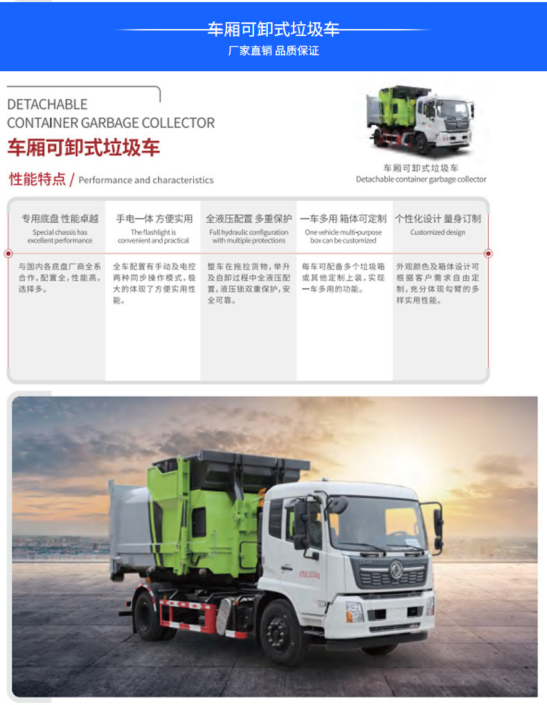 垃圾車價格_純電動垃圾車_東風天錦純電動車廂可卸式垃圾車★13908669111★產品名稱CSC5180ZXXDBEV型純電動車廂可卸式垃圾車,采用東風DFH1180BEV1底盤改裝而成,該車用于垃圾的收集清運,主要專用裝置為勾臂.整車美觀大方,全液壓配置多重保護能與大中型壓縮垃圾車或整體站無縫對接,提高經濟效益。更多垃圾車盡在:www.jinshengjie.cn