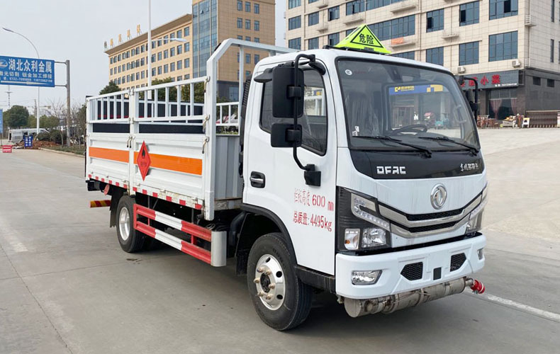 該車為危險品運輸車,運輸具有獨立容器(瓶)包裝的貨物,運送危險品類項號:2.1;2.2.側,后防護材料均為Q235,側防護螺栓連接,后防護焊接,后防護截面尺寸φ100mm,下邊緣離地高390mm.選裝后部無尾板,選裝后部無尾板時,后防護螺栓連接,截面尺寸(mm):100×50,下邊緣離地高390mm.發動機/油耗值(L/100km)對應關系為:CY4BK161/11.3,YCY24140-60/11.3,D20TCIF1/11.3,CA4DB1-11E6/11.4,CA4DB1-13E6/11.3,Q23-115E60/11.1,Q28-130E60/11.2.僅選用前輪盤式制動器,前置排氣管,子午線輪胎,限速裝置的底盤,限速80km/h,轉向輪安裝爆胎應急防護裝置.該車安裝帶有衛星定位功能的行駛記錄儀.ABS型號/生產廠家:ABS/ASR-24V-4S/4M/襄陽東風隆誠機械有限責任公司.隨底盤廠家選裝駕駛室前圍.尾板收起狀態水平長度為280mm,尾板質量為350kg.廂體選裝無柵欄,選裝柵欄樣式,選裝貨箱箱板結構.選裝ETC。選裝燃油箱,電瓶,尿素罐,儲氣筒左右安裝位置。該車型僅選用排量小于等于2500ml的發動機。