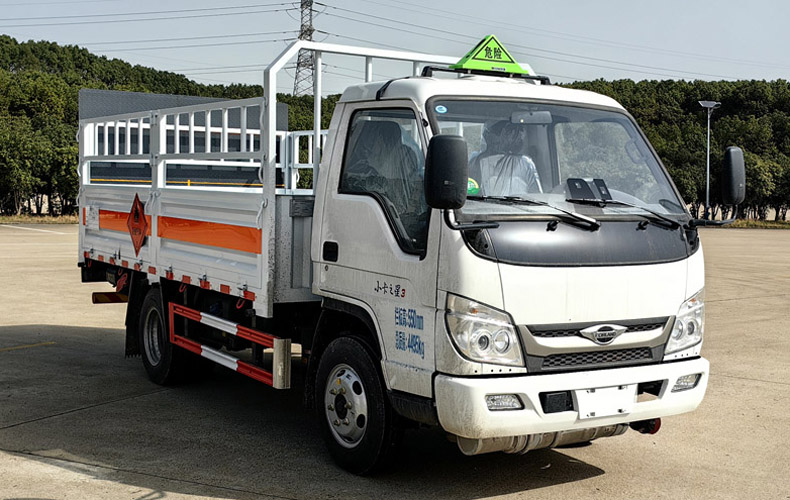 該車適用于運輸危險品,用于運輸具有獨立容器(瓶)包裝的物品,運送危險類項號:2.1,2.2.運輸易燃氣體時掛2.1類警示牌,運輸非易燃無毒氣體時掛2.2類警示牌.側、后防護材料均為Q235,螺栓連接,后防護截面尺寸(mm)φ100,下邊緣離地高430mm.液壓尾板收起狀態水平長度為280mm,尾板質量為350kg.選裝后部無尾板時,后防護材料為Q235,螺栓連接,截面尺寸(mm)100×50,下邊緣離地高430mm.僅選用排氣管前置、限速裝置(限速80km/h)、前輪盤式制動及子午線輪胎的底盤;轉向輪裝備輪胎爆胎應急防護裝置.安裝帶有衛星定位功能的行駛記錄儀.ABS系統控制方式為4S/4M,氣剎:ABS型號為CM4XL-4S/4M,生產廠家為廣州瑞立科密汽車電子股份有限公司.液剎:ABS型號為CM4YL,生產廠家為廣州瑞立科密汽車電子股份有限公司.液剎:ABS型號為CM0953YL,生產廠家為廣州瑞立科密汽車電子股份有限公司.發動機/油耗值(L/100Km)對應關系為:Q23-115C60/11.40,Q23-115E60/11.12,Q23-132E60/11.17.僅選用軸距2850mm.整車外形尺寸長/后懸對應關系為(mm):5540/1560,5450/1470,5250/1270.選裝直接供電式ETC車載裝置.整備質量不含備胎,包含滅火器及隨車工具;貨箱重量540kg,480kg,貨箱材質/厚度:底板Q235/3mm,槽鋼/2.5mm;墻板Q235/1mm.選裝尾板樣式.隨底盤選裝新前格柵及新logo.選裝新前圍及裝飾件、前部燈具等.選裝欄板樣式,廂體選裝無柵欄,選裝柵欄樣式,選裝貨箱欄板結構.
