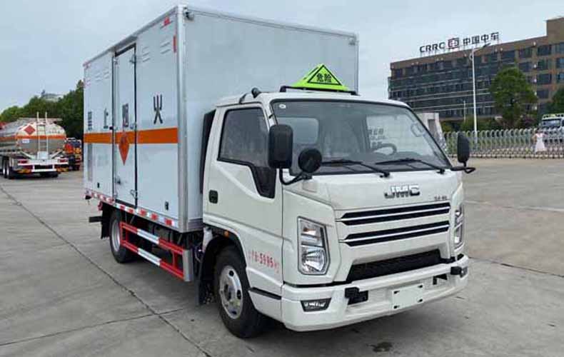 ABS型號:APG3550500A,VIE ABS-II;ABS生產企業:浙江亞太機電股份有限公司,浙江萬安科技股份有限公司;安裝有限速裝置;限速裝置限速(km/h):80;安裝有具有衛星定位功能的行駛記錄儀;選裝描述:選裝排半駕駛室.該車型可選裝ETC車載裝置;發動機/油耗值(L/100km)對應關系為:JX4D30A6H/11.6,JX4D30B6H/13.5;所用材料材質、連接方式以及后部防護裝置的主要尺寸參數(斷面尺寸和離地高度):側,后防護材料均為Q235,側防護螺栓連接;后防護焊接,截面尺寸100×50mm,下邊緣離地高400mm;車廂頂部封閉且不可開啟;運輸獨立容器(瓶)包裝的貨物;EX/Ⅲ型車輛;危險貨物類項號:1.1B,1.1G,1.3C,1.1D,1.2D,1.3C,1.1C,1.4G;其他說明:僅選用排氣管前置、限速裝置、前輪盤式制動及子午線輪胎的底盤;轉向輪安裝輪胎防爆應急防護裝置。廂體側面選裝開門型式及位置,選裝不帶側開門,選裝瓦楞板結構;廂體側面板選裝開百葉窗。選裝駕駛室。