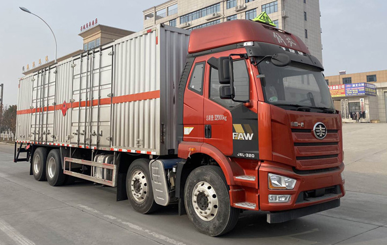 1、該車適用于運輸危險品,運輸具有獨立容器(瓶)包裝的物品。廂體頂部封閉,不可開啟。運送危險物品類項號:2.1,2.2。2、側、后防護材料為Q235,側防護螺栓連接,后防護焊接,截面尺寸(mm)120×50,下邊緣離地高345mm。選裝無后尾板時,后防護焊接,截面尺寸(mm)120×50,下邊緣離地高345mm。尾板收起狀態水平長度為290mm,尾板質量為550kg。3、僅選用排氣管前置、限速裝置(限速79km/h)、前輪盤式制動及子午線輪胎的底盤,轉向輪安裝輪胎爆胎應急防護裝置,后軸采用空氣懸架。安裝帶有衛星定位功能的行駛記錄儀。EBS型號/生產廠家:EBS3/威伯科汽車控制系統(中國)有限公司。發動機/油耗值(L/100km)對應關系為:CA6DK1-32E61/38.16,CA6DK1-28E61/38.16。選裝ETC。隨底盤選裝駕駛室。廂體側面選裝開門型式及位置,選裝不帶側開門,選裝平面結構,選裝后門結構;廂體前后及側面選裝開百葉窗,選裝后尾板樣式。僅選用1900+4500+1350mm軸距。發動機凈功率值:CA6DK1-32E61為236kW,CA6DK1-28E61為206kW。