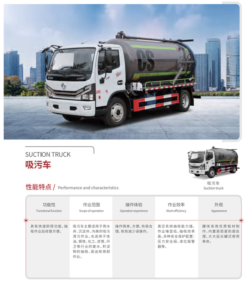該車用于吸糞,主要專用裝置為吸糞總成。罐體采用武鋼優質碳鋼板,厚度5-6mm,龜背式設計,永久不變形.帶洗手裝置,配置億豐真空泵(威龍泵及雙聯泵價格另計),水油分離器,防溢閥,吸糞管6米/根,吸糞車帶360°旋轉吊桿座,排放采用自排和壓力排放,安裝浮球液位控制器,帶電子報警裝置.可自吸自排,抽吸方便,具有真空度高、吸程遠的特點,可滿足不同用戶在不同的使用環境中使用. 吸糞車可根據客戶要求加裝灑水功能,水、糞罐可獨立分倉,即可吸糞又可灑水,一車兩用.