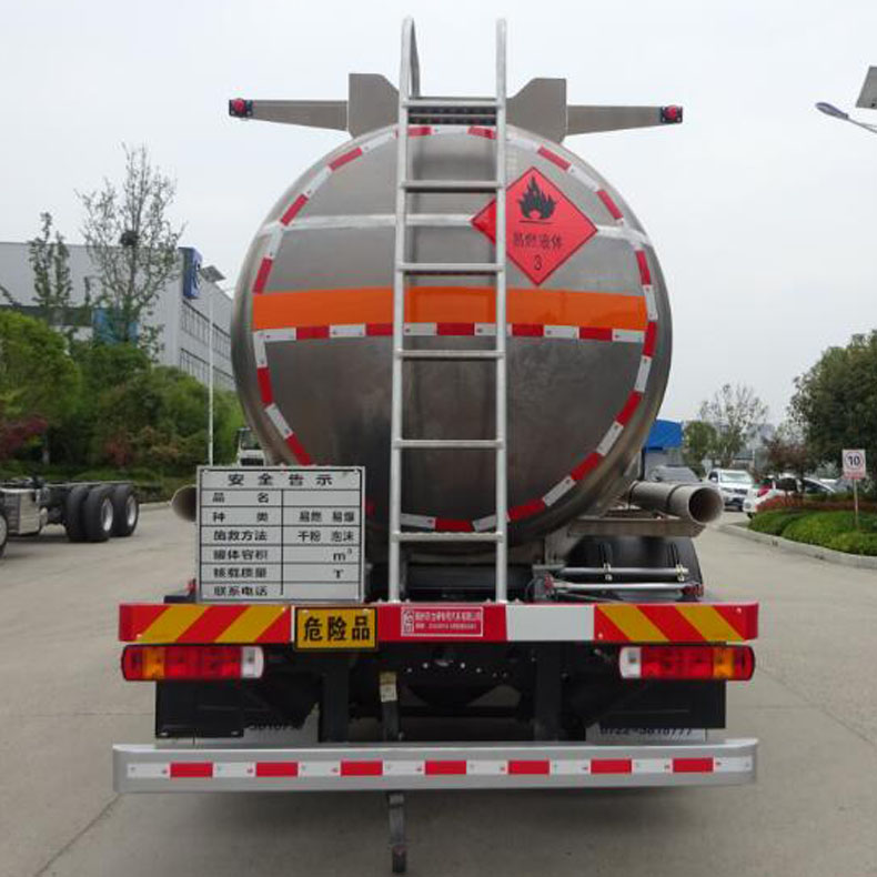 罐體總容量:21.5立方米,罐體有效容積:20.4立方米,危險貨物運輸車輛的類型為FL型,介質zui大密度830千克/立方米;罐體尺寸(長×直徑)(mm)為:7650×1960;僅采用1900+5100mm軸距;選裝側防護工具箱樣式,選裝尾部出口箱樣式,選裝管廂樣式,選裝罐頂保護裝置樣式,選裝后爬梯位置;側防護裝置材料材質:鋁合金6061,后防護裝置材料材質:Q235B,側、后防護均采用螺栓連接,后防護裝置斷面尺寸為(mm):80×150,后部防護離地高度:450mm;僅采用底盤子午線輪胎;安裝具有衛星定位功能的行駛記錄儀;排氣管前置,安裝前輪盤式制動器和限速裝置,限速79km/h,安裝EBS,EBS控制系統生產廠家/型號:威伯科汽車控制系統(中國)有限公司/EBS3;發動機型號及油耗值(L/100km)為:CA6DH1-26E61(26.04),CA6DH1-24E61(26.04),CA6DH1-22E61(26.04);該車后軸采用空氣懸架;轉向輪安裝bao胎應急防護裝置;該車型可選裝ETC車載裝置.
